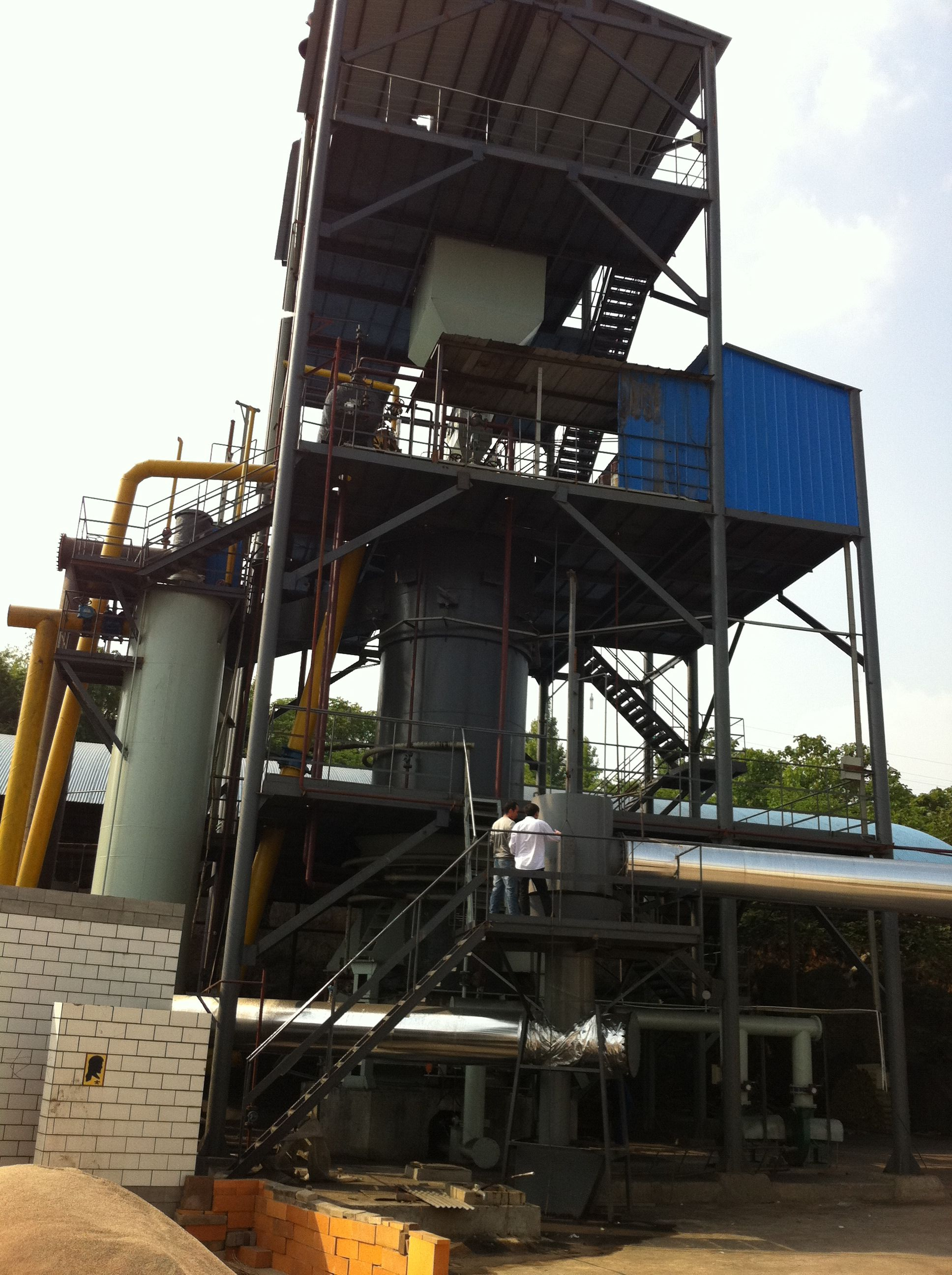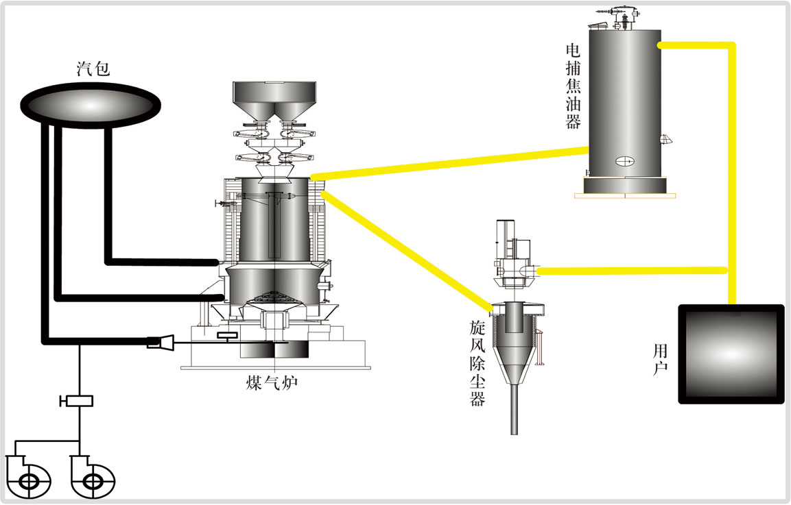 煤氣發(fā)生爐是將煤炭轉(zhuǎn)化為可燃性氣體——煤氣(主要成分為CO、H2、CH4等)的生產(chǎn)設(shè)備。工作原理為:將符合氣化工藝指標(biāo)的煤炭篩選后,由加煤機(jī)加入到煤氣爐內(nèi),從爐底鼓入自產(chǎn)蒸汽與空氣混合物做為氣化劑。煤炭在爐內(nèi)經(jīng)物理、化學(xué)反應(yīng),生成可燃性氣體,上段煤氣經(jīng)過旋風(fēng)除油器、電捕器過濾焦油.下段煤氣經(jīng)過旋風(fēng)除塵器清除灰塵,經(jīng)過混合后輸送到用戶使用。